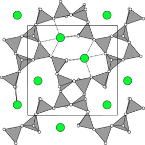 | The structure of tetragonal leucite of Mazzi et al. (1976) 0 < z < 0.25, to illustrate the approximate structure of ammonioleucite. The ammonium cations (green circles) occupy the K sites of leucite (or the H2O sites of analcime), and are coordinated with six framework oxygen atoms (five are shown). | |||